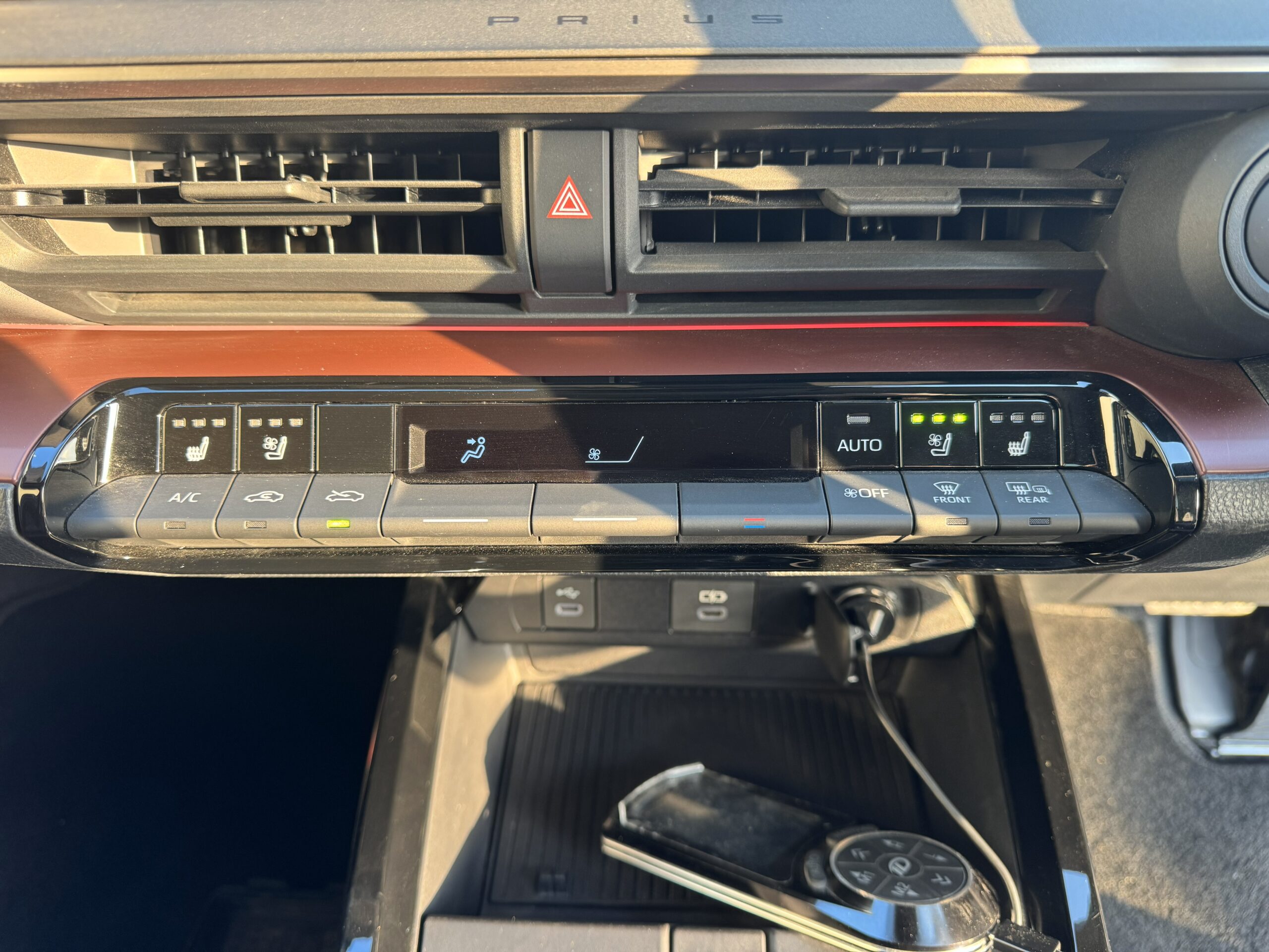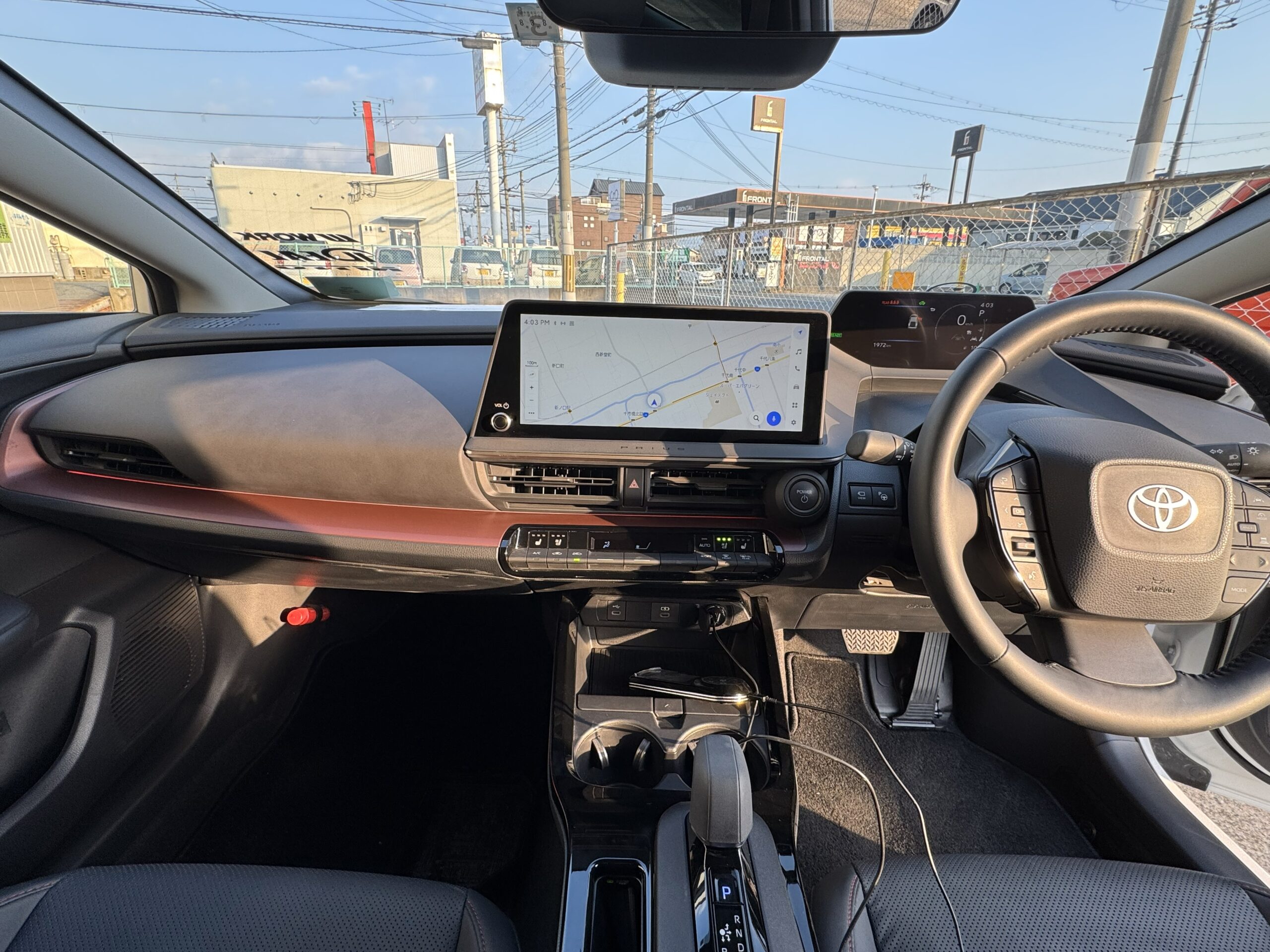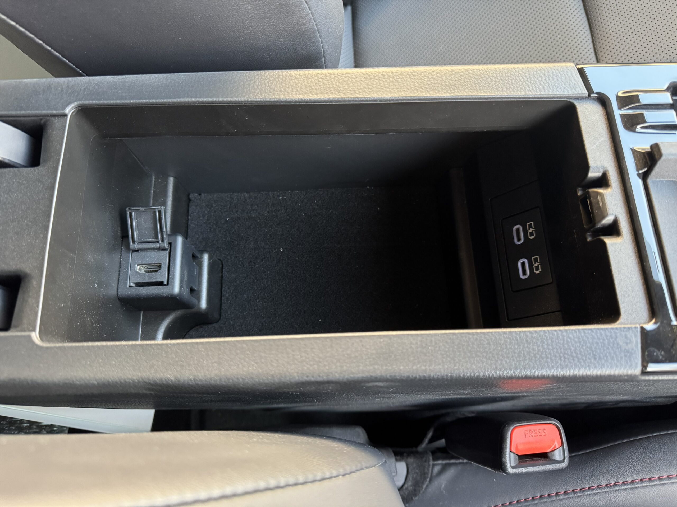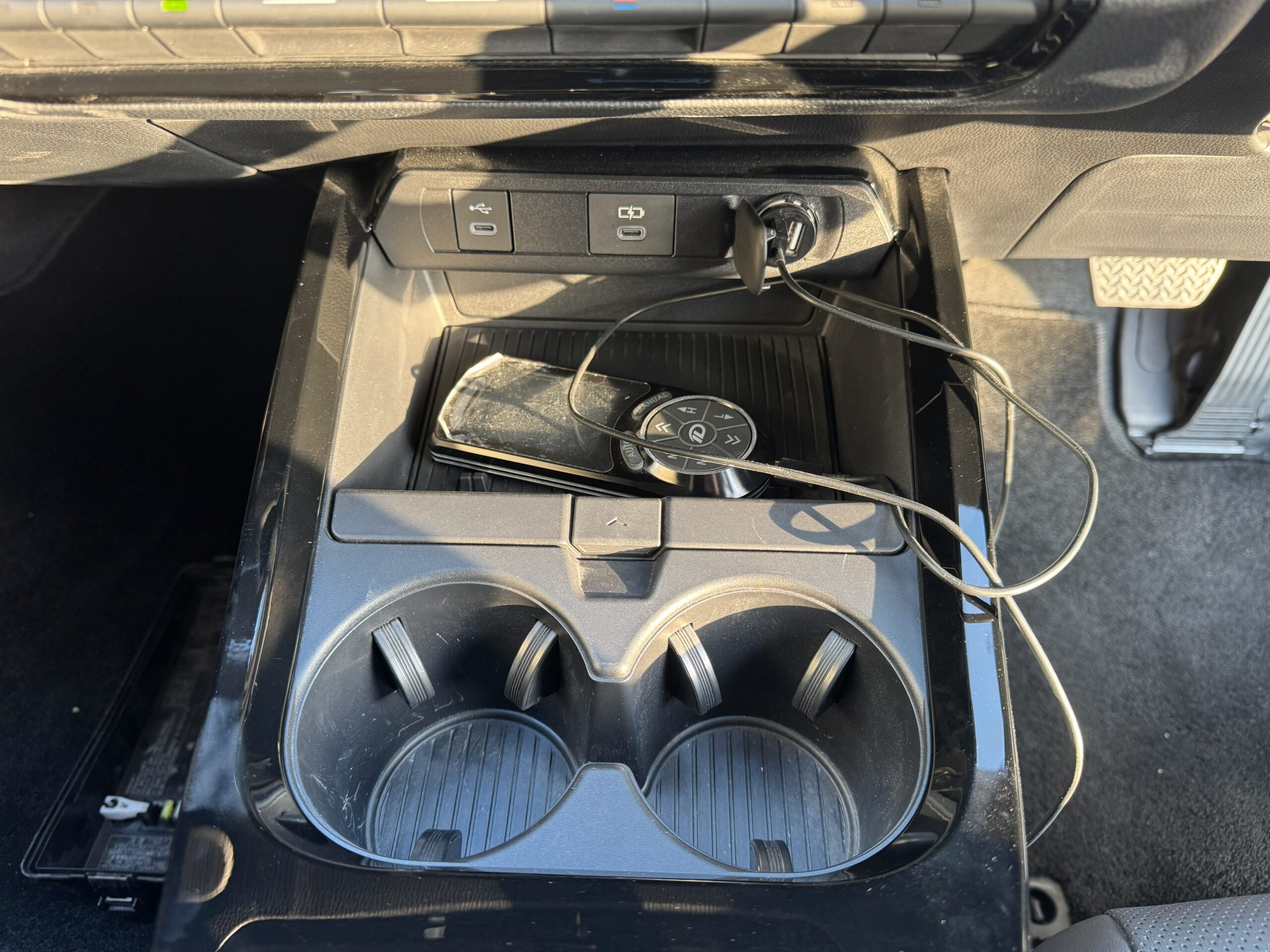 ドリンクホルダー周りとなります。広々とした物置場所がございますので、スマホ等を充電しながらここに置いておけます。
